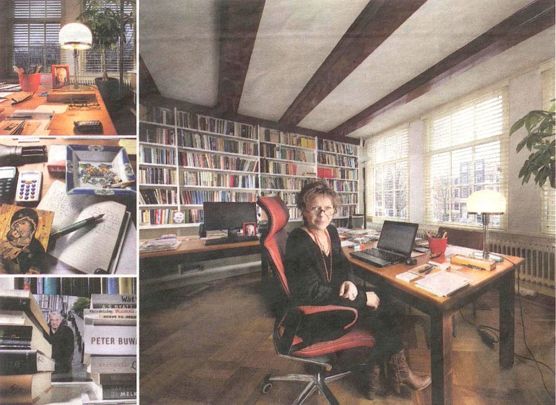 The national paper NRC featured an article about the workspace of a well known writer, Connie Palmen. The article featured this image, in which the bookshelf-system specifically designed to fit Connie's books can be seen in the background. image: Mark Kohn, NRC Handelsblad