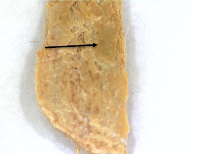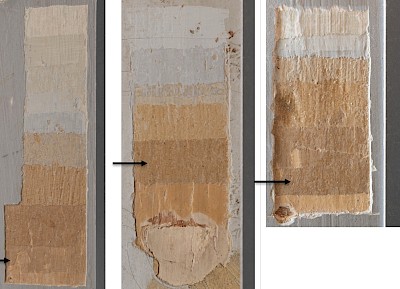 Stratigraphy of columns on the 2nd floor. The arrow indicates the original finishing stage.