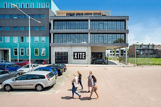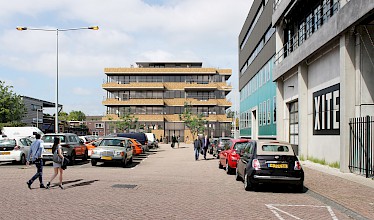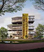 For a large international media company, a new headquarters has been envisioned in Amsterdam Noord. The two-storey high concrete base takes reference from airplane hangars, and can therefore be opened up to the street when organising and hosting large events. Sitting on top of this plinth is a garden that is accessible. The higher floors contain interconnected work spaces, with these maintaining a direct connection to outside terraces that provide the opportunity for working outside.