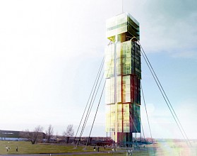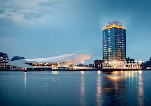 For the façade, a translucent glass skin wraps around the stepped form that allows for a clean sheet-like surface that can host iconography. The pattern selected will allow for transparent areas to provide views out, whilst more translucent areas will obscure structure. This skin will be patterned with an abstract Dutch image that embraces the iconic Delfts Blue.